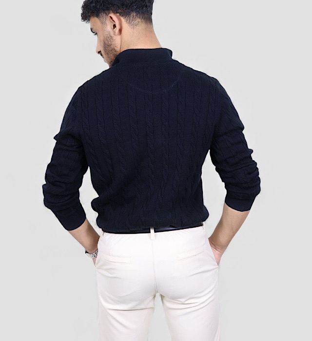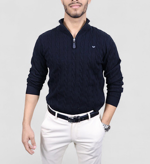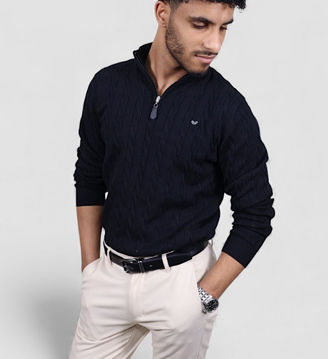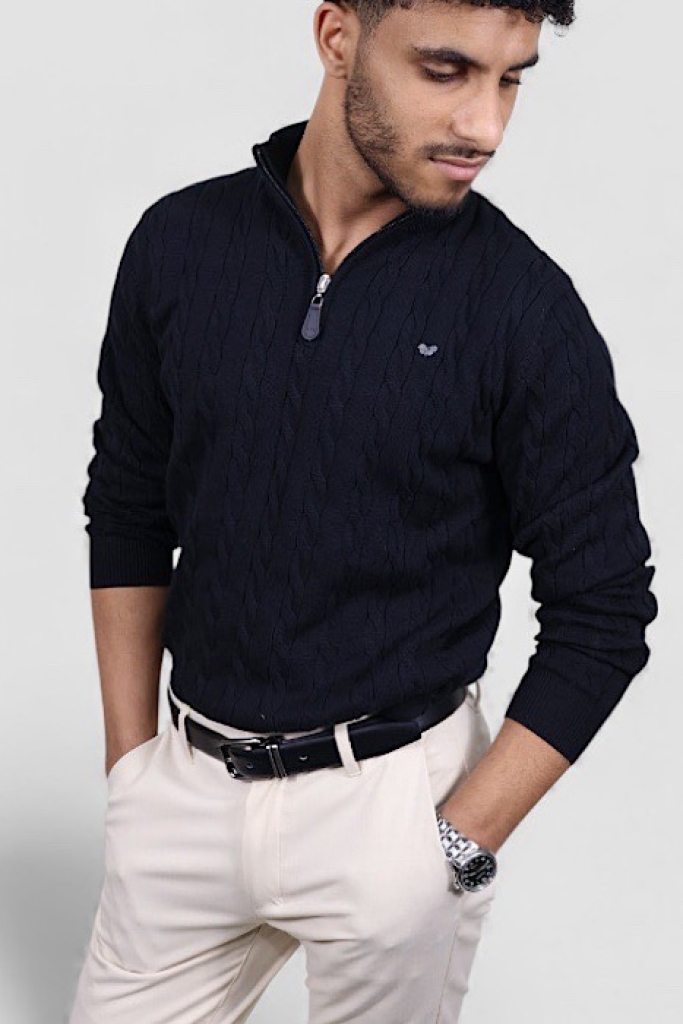 סריג צמות VACCI לגבר – חצי רוכסן סריג אלגנטי בגוון שחור כהה, מעוצב בדוגמת צמות עשירה המעניקה עומק, טקסטורה ומראה חורפי יוקרתי ונקי הסריג עשוי 100% כותנה איכותית, נעימה, נושמת ומלטפת, לנוחות מושלמת לאורך כל היום כולל חצי רוכסן המאפשר התאמה אישית ללוק – סגור למראה קלאסי או פתוח למראה קליל ומעודכן.בחירה מושלמת ליום-יום, לפגישות ולאירועים, ומתאים במיוחד לשילוב מעל חולצה מכופתרת לסטייל אלגנטי ומוקפד