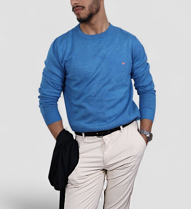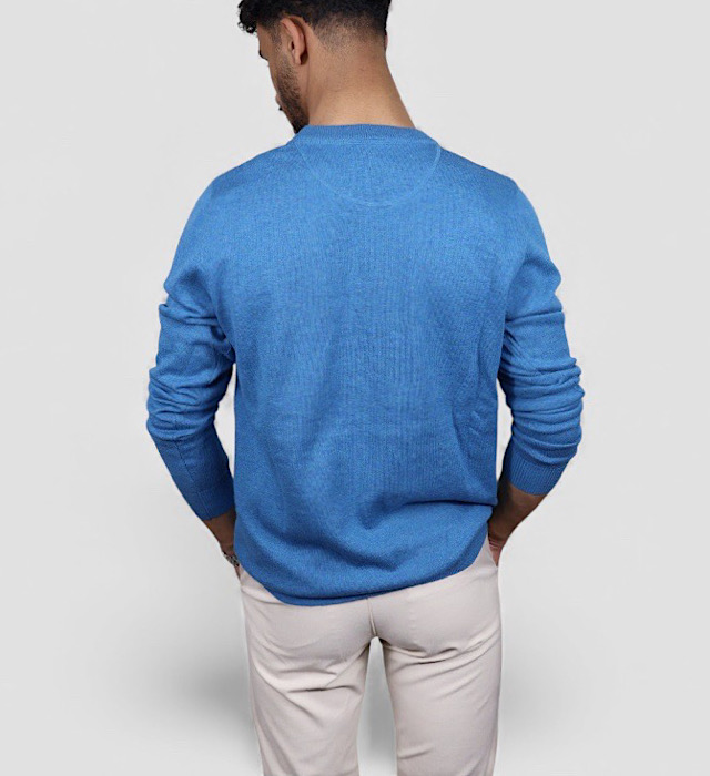 סריג VACCI לגבר 100% כותנה איכותית סריג אלגנטי בגוון תכלת מלאנז' בהיר, מעוצב בטקסטורה מחורצת המעניקה מראה חורפי יוקרתי ונקי.עשוי מ־100% כותנה נעימה, נושמת ומלטפת מושלם ליום יום ולמפגשים ,ומתאים לשילוב מעל חולצה מכופתרת או לבוש קז’ואל מוקפד